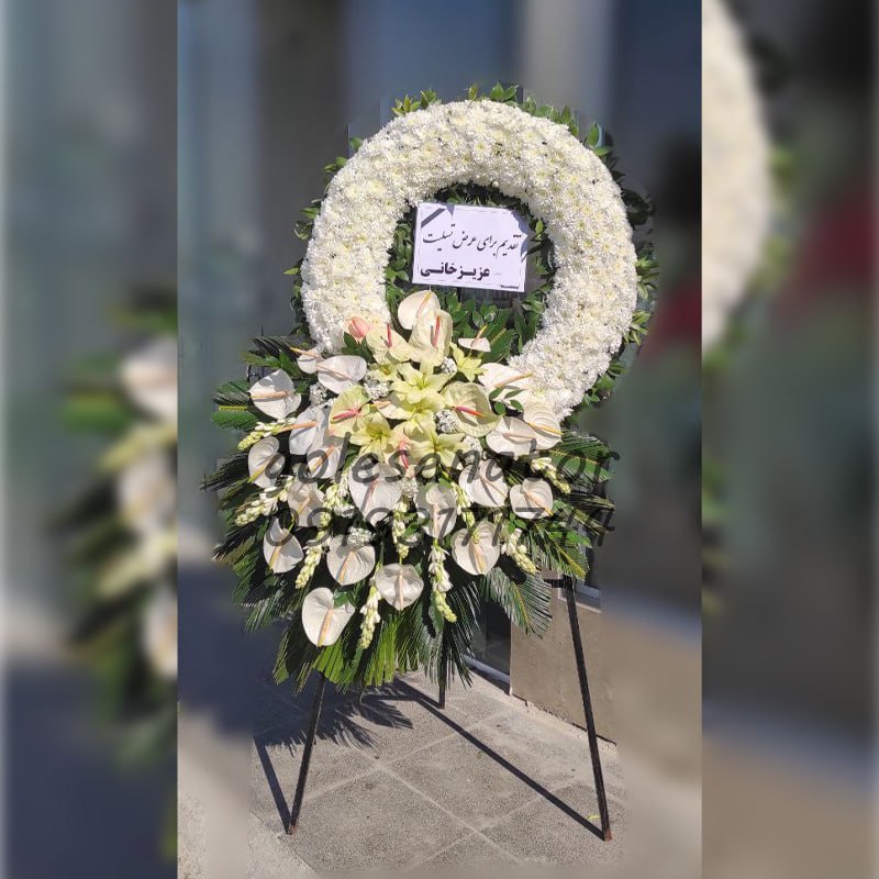 این تاج گل ترحیم با ارتفاع ۱.۸۰ متر، اثری ظریف و معنادار برای مراسم یادبود است. ترکیب گلهای انتریوم، لیلیوم، داوودی و مریم، پالت رنگی ملایم و آرامشبخشی ایجاد کرده که مناسب فضای سوگواری میباشد. طراحی این اثر با رعایت تعادل و تناسب بین گلها انجام شده است.